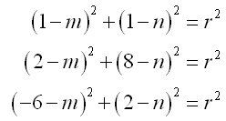 Středová rovnice kružnice má tvar (x-m)2 + (y-n)2 = r2 . Tuto rovnici musí splňovat všechny zadané body. Dosadíme postupně (třikrát) do rovnice za x a y souřadnice zadaných bodů (první za x a druhou za y) a tak získáme soustavu tří kvadratických rovnic.