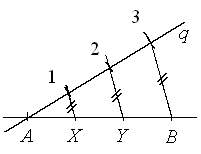 Body 1 a 2 vedeme rovnoběžky s přímkou 3B. Na úsečce AB vzniknou body X a Y, které mají od bodu A vzdálenost